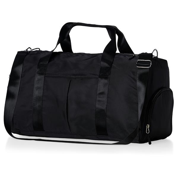 Bolsa esportiva de 36 litros em poliéster resistente à água com cinco compartimentos, sendo dois deles exclusivos para tênis e itens molhados. Contém bolso para encaixe em malas de viagem, bolso interno, alça de mão lateral extra e acompanha alça transversal. Gravação da logomarca em 1 cor já inclusa.