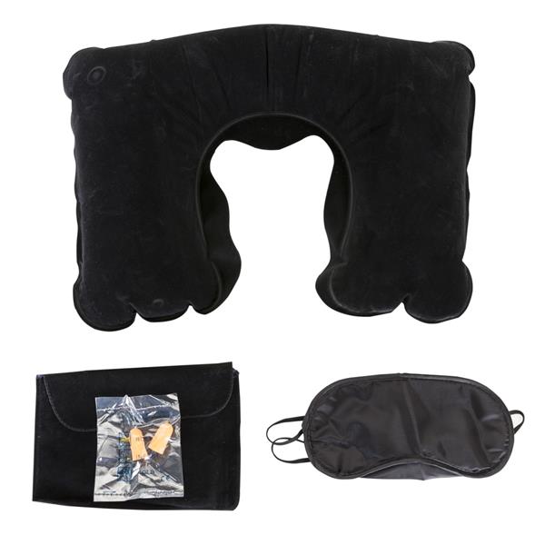 Kit viagem com 3 peças, contém: travesseiro inflável(revestido de veludo), máscara para olhos de cetim(revestido com espuma) e um par de protetor auricular. Acompanha uma nécessaire de veludo para guardar o kit. Gravação da logomarca em 1 cor já inclusa.