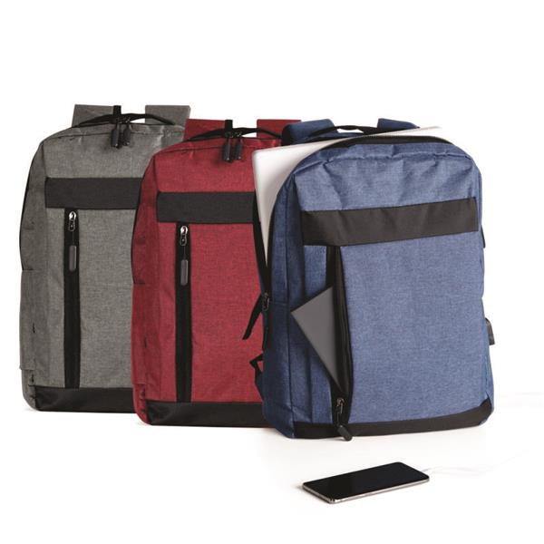 Mochila de nylon 21 litros com dois compartimentos, sendo o principal com bolso para notebook 156. Com divisórias internas para acessórios, a mochila possui bolso lateral, suporte externo usb e alça para encaixe em malas de viagem. Gravação em 1 cor já inclusa.